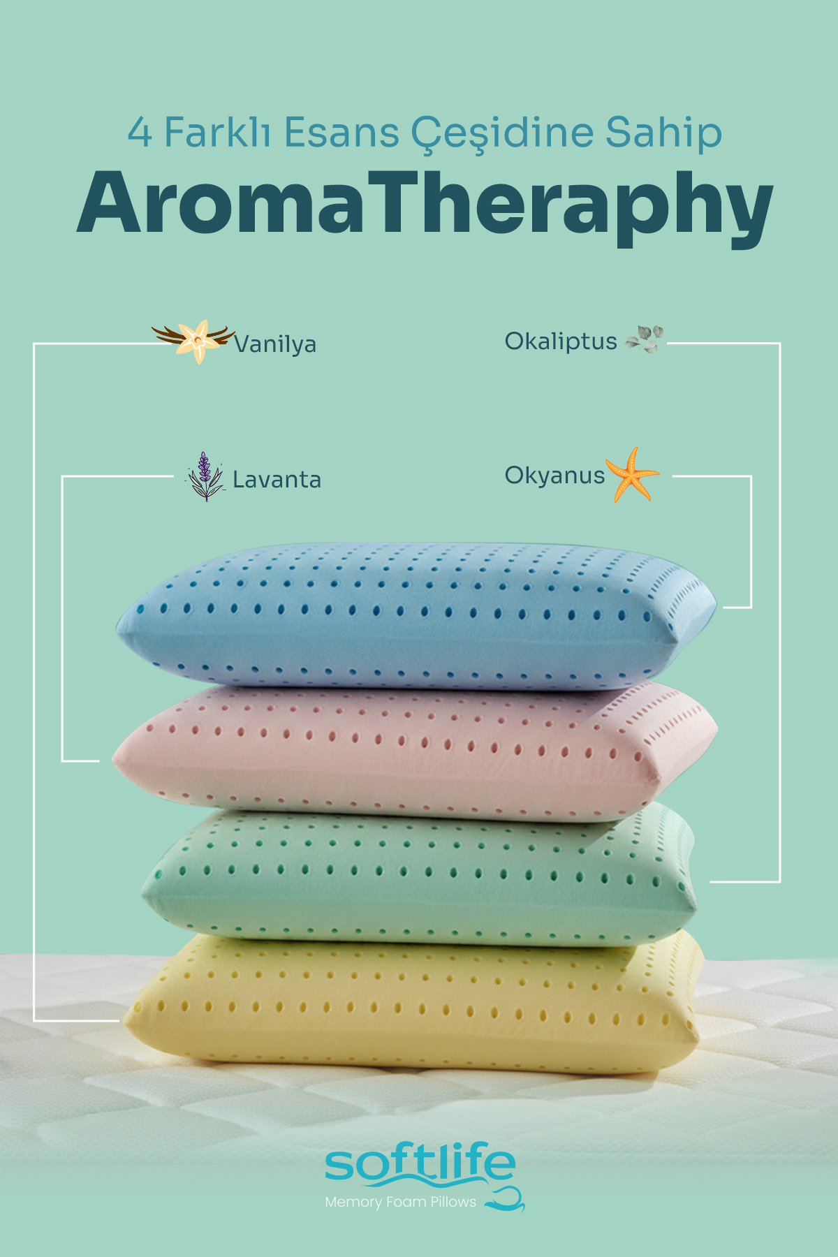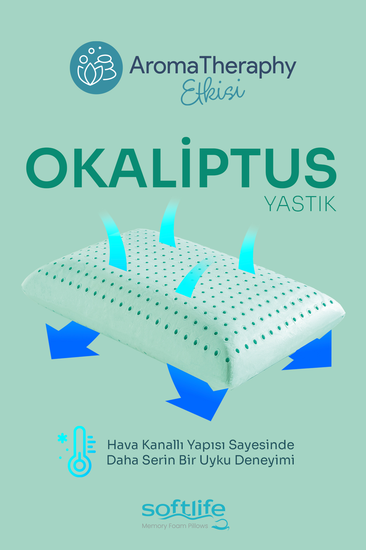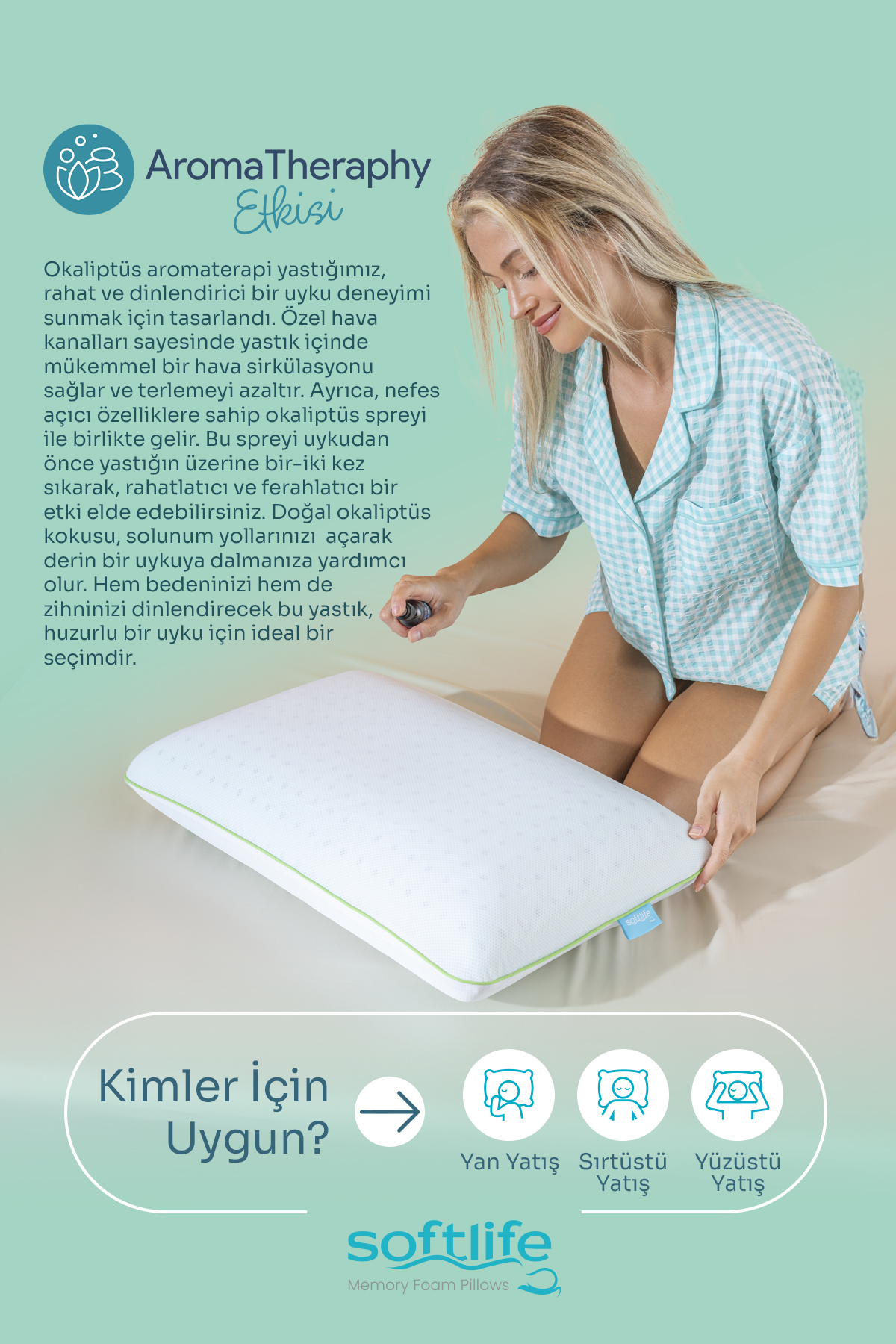 Softlife Aroma Therapy Okaliptüs yastık, doğanın huzur verici etkilerini yatak odanıza getiriyor. Özel hava kanalları sayesinde, mükemmel bir hava sirkülasyonu sağlayarak terlemeyi azaltırken, yastık ile birlikte verilen doğal okaliptüs yağının ferahlatıcı kokusu, solunum yollarını açarak rahat nefes almanızı sağlar. Soğuk algınlığı ve grip gibi hastalıkların semptomlarını hafifletirken, burun tıkanıklığı, öksürük ve sinüs basıncını azaltır.