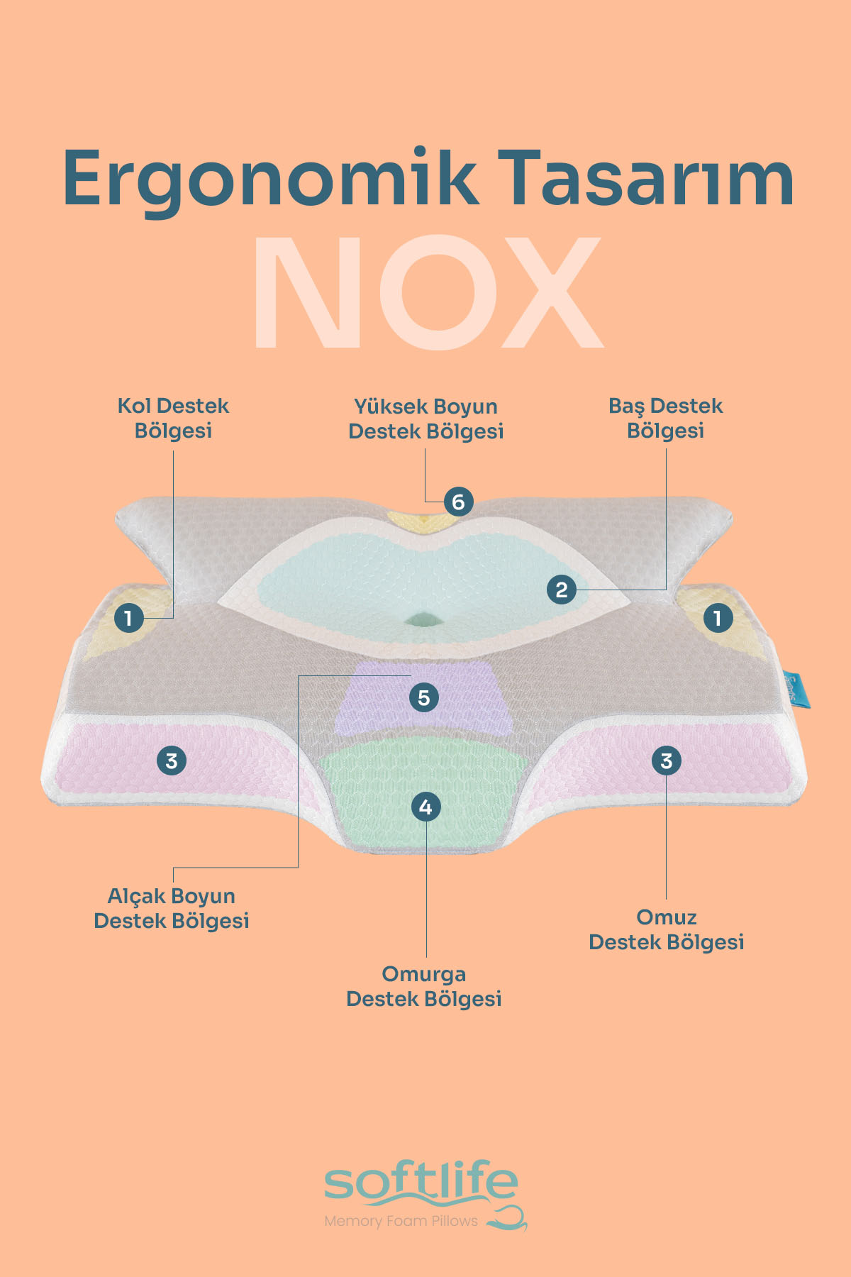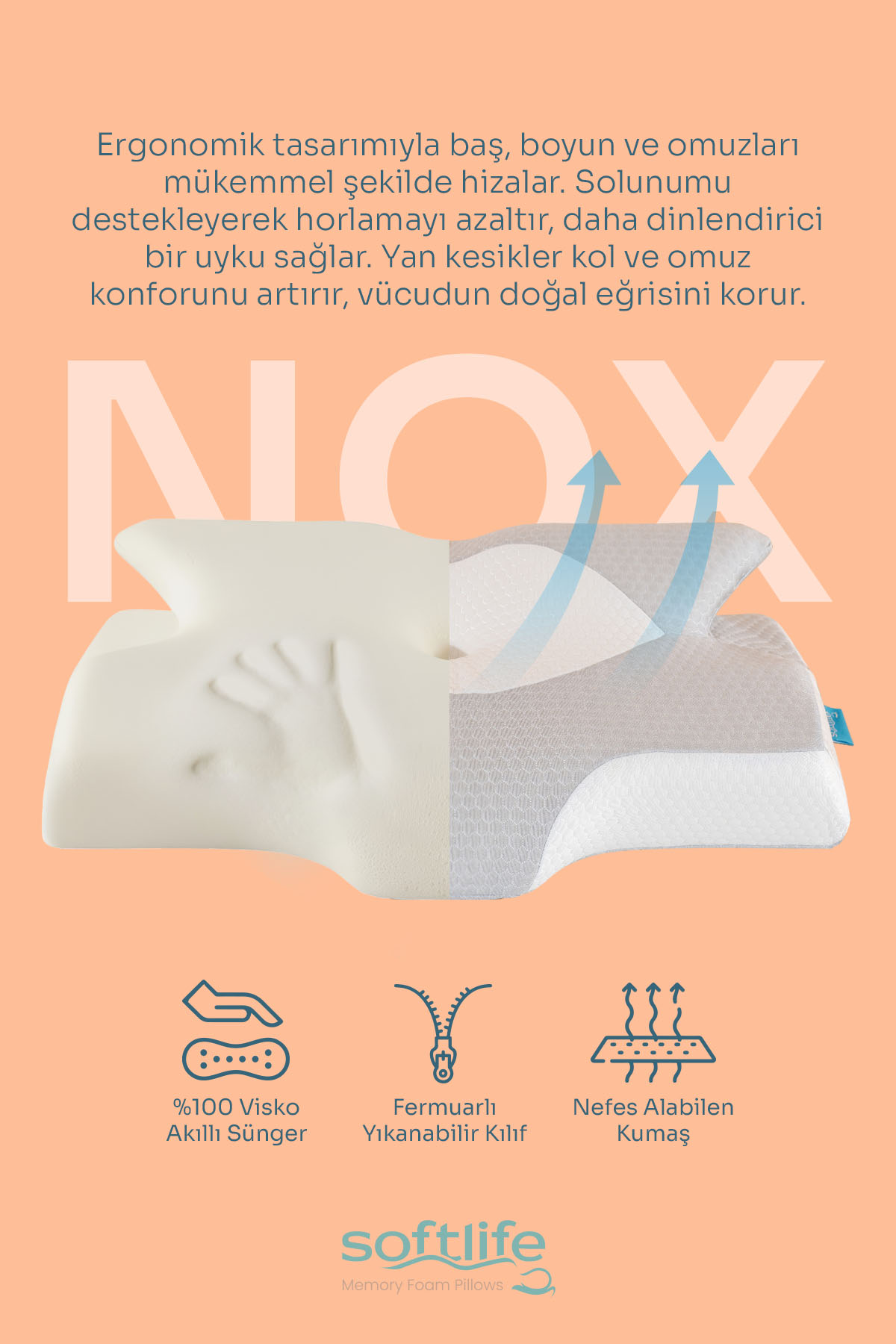 Softlife Nox yastığın kontur tasarımı başınızı, boynunuzu, omuzlarınızı ve sırtınızı tam olarak destekler ve hizalar.