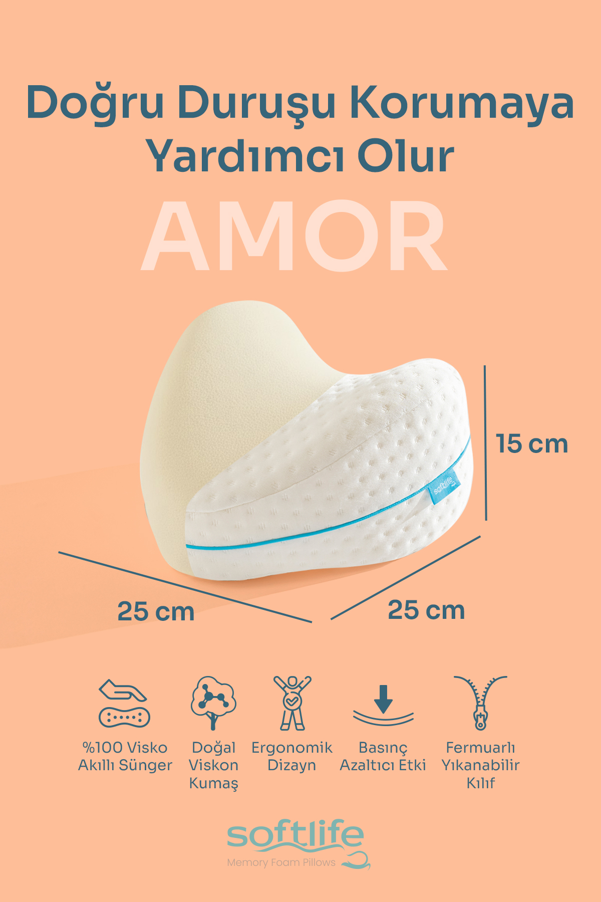 AMOR Visco Kalp Model Diz Arası Yastık Bacak Arası Ortopedik Yastık Visco Yastık 25x25x15cm